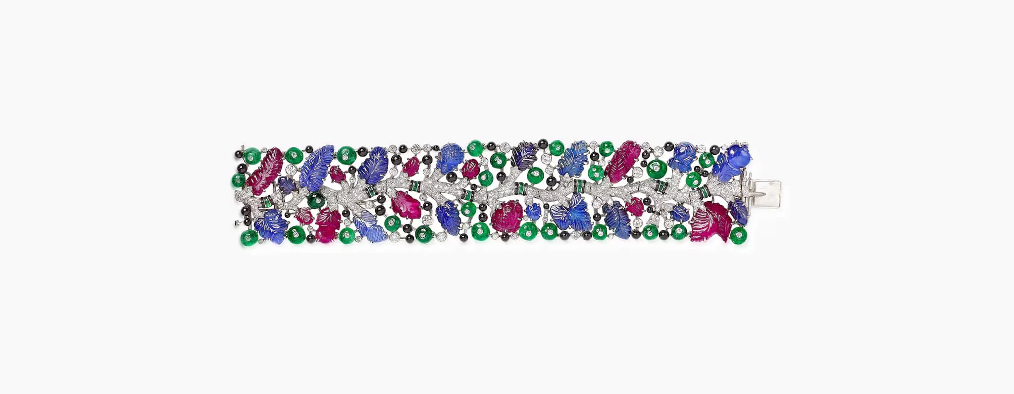 Cartier’s Tutti Frutti assortment — based mostly on carved colored gem stones set into platinum and diamonds — dates again to the Twenties and stays emblematic of Artwork Deco design. Sapphires, rubies and emeralds carved or sculpted into leaves, buds and berries, or lower as cabochons, clean or fluted beads, have made Tutti Frutti creations a signature of Cartier type for a century. Impressed by India — whose affect stays as vibrant as ever for the Maison — these designs rejoice a ardour for combining volumes, colors and shapes. A notable instance from 1925 brings collectively valuable carved gems in a wealthy composition — diamonds, sapphires, emeralds and rubies formed as leaves or berries, accented with onyx and black enamel, all mounted on platinum — transferring past the individually set “foliage” items recorded in Cartier’s archives. Authentic Tutti Frutti bracelets from the Twenties/30s are uncommon and wanted, with public sale outcomes often coming into the seven-figure vary relying on provenance and situation.