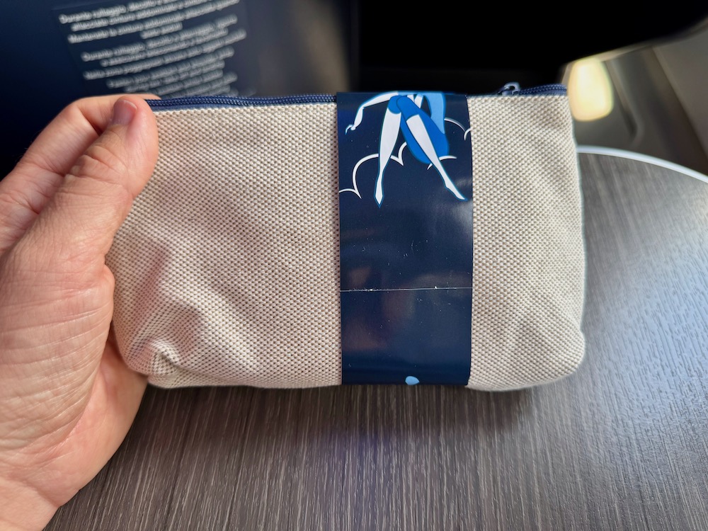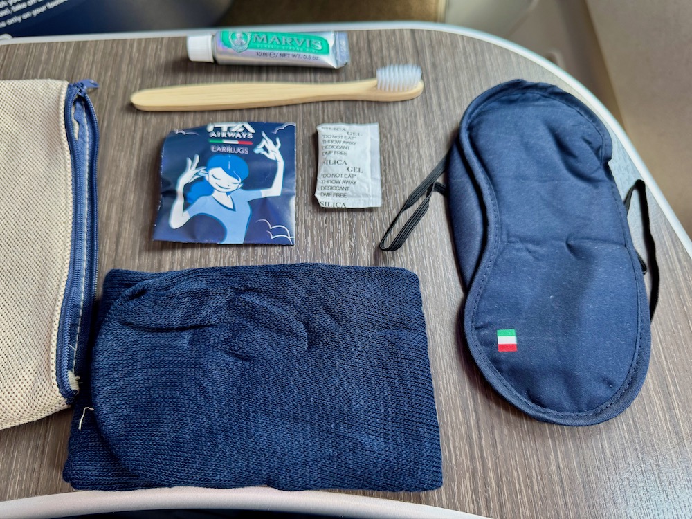 - An amenity package in an eco-friendly canvas pouch containing a watch masks, earplugs, cozy socks, and a dental package with a bamboo toothbrush and premium toothpaste.